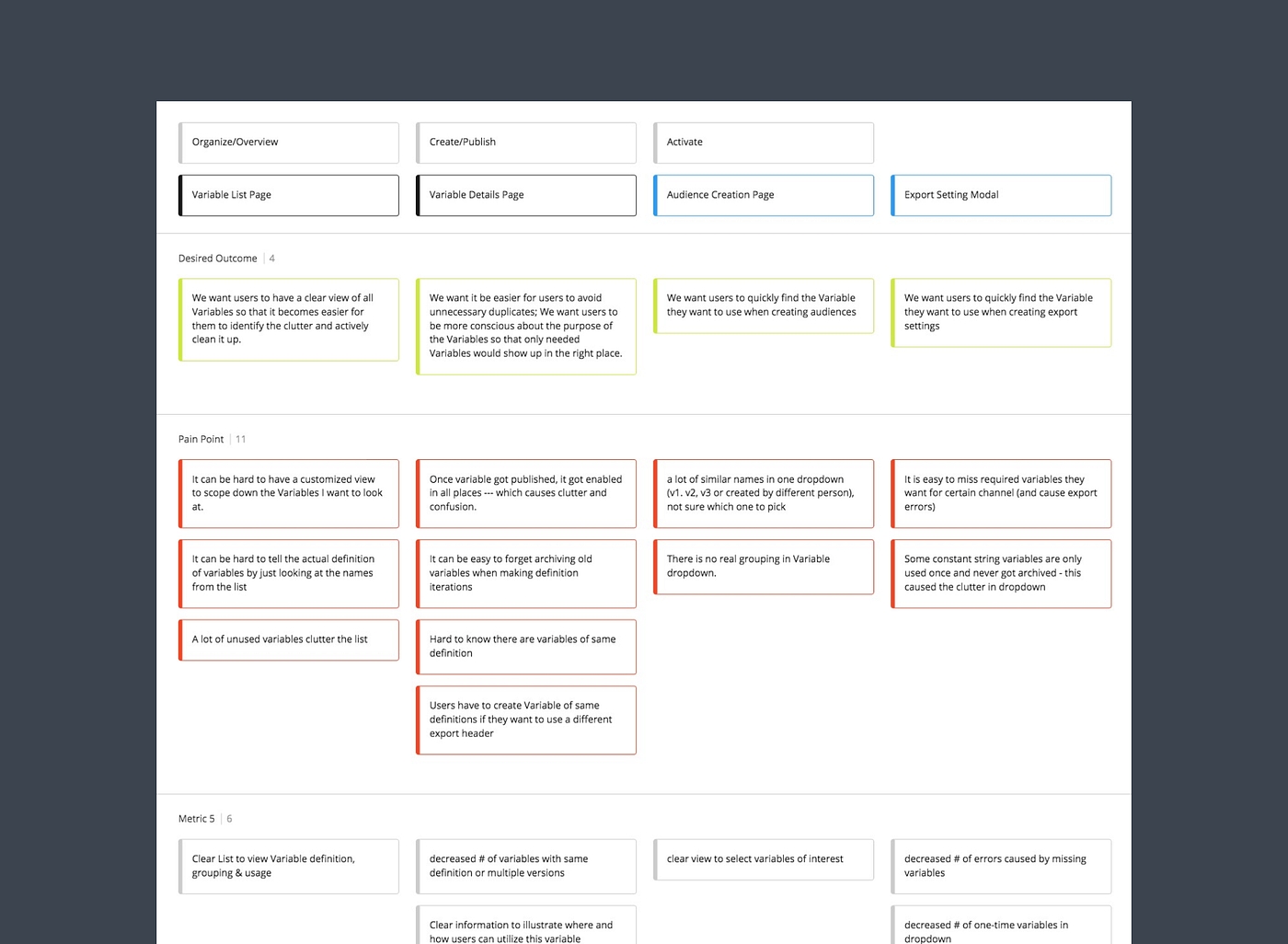 Created a journey map that identified the root cause of Variable clutter and its impact on user workflow across different touch points. Tagged, merged and prioritized potential projects with Engineering and Product teams.